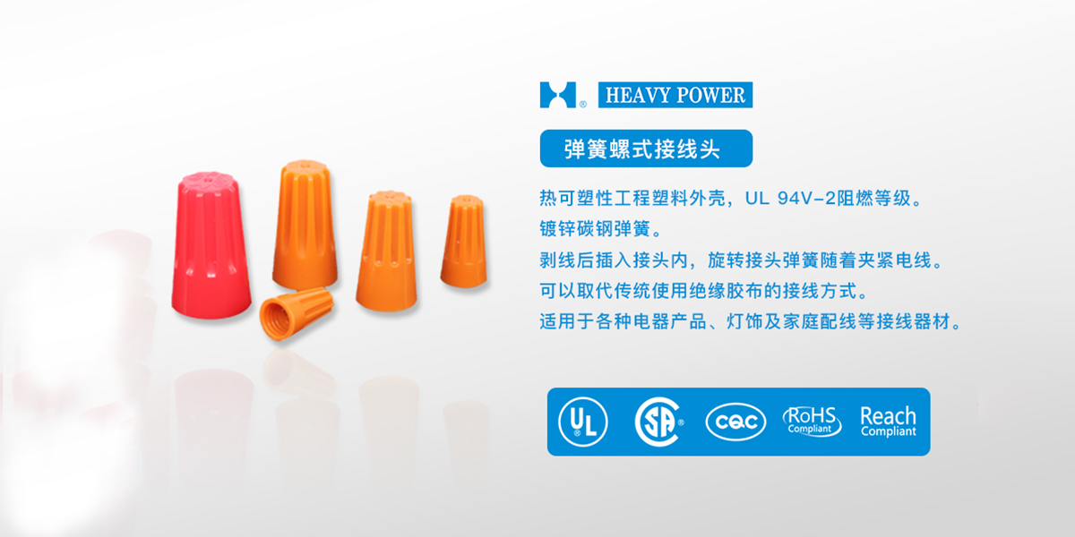 1.熱可塑性工程塑料成型外殼,UL 94V-2阻燃等級。2.鍍鋅碳鋼彈簧。3.電線剝線后插入接頭內(nèi),旋轉(zhuǎn)接頭,彈簧隨著夾緊電線。4.可以取代傳統(tǒng)使用絕緣膠布的接線方式。5.適用于各種電器產(chǎn)品、燈飾及家庭配線等接線器材。6.多色可選。