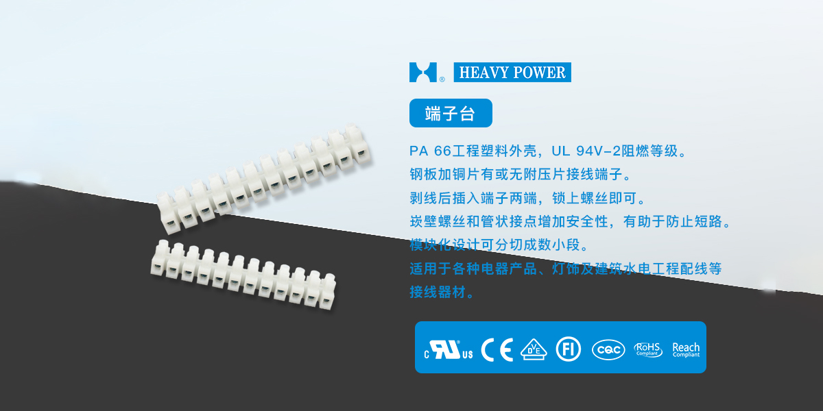 一、端子臺產(chǎn)品特點1.PA 66工程塑料外殼,UL 94V-2阻燃等級。2.鋼板加銅片有或無附壓片接線端子。3.剝線后插入端子兩端,鎖上螺絲即可。4.嵌壁螺絲和管狀接點增加安全性,有助于防止短路。5.模塊化設(shè)計可分切成數(shù)小段。6.適用于各種電器產(chǎn)品、燈飾及建筑水電工程配線等接線器...